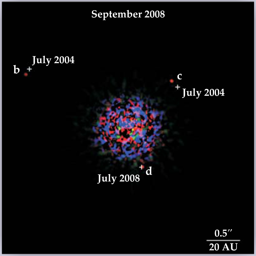 Figure 2. HR 8799’s third planet (labeled d), only 24 AU from the star, was revealed in follow-up observations with the Keck II telescope in July 2008. In this composite image, which superposes observations at various near-IR wavelengths (shown in false colors) with Keck II in September 2008, the residual stellar glare that survives the angular differential imaging has not been erased. The dated crosses indicate how each planet has moved since it was first imaged. All three displacements are consistent with circular Keplerian orbits seen face-on.