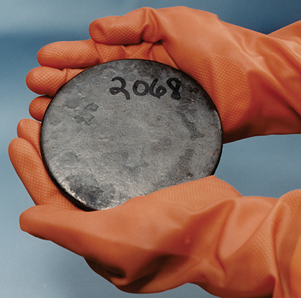 A “button” of highly enriched uranium metal. HEU comes in various forms, including oxides, solutions, and new or irradiated reactor fuel. All HEU is considered weapons usable.