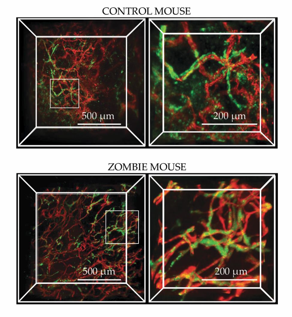 Fluorescence images show the propagation of nanoparticles in the tumors of control tumor-bearing mice, which were alive, and Zombie mice, all of whose cells were dead. In the control mouse, nanoparticles (green) are able to escape the blood vessels (red), but in the Zombie mouse they can’t. (Adapted from ref. 1.)