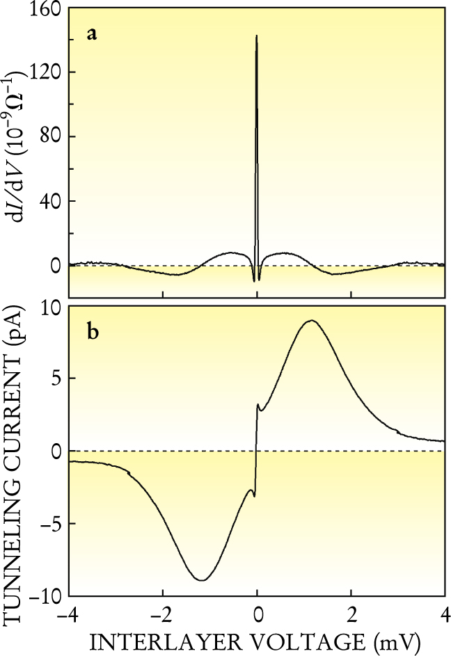 As the voltage dropped to zero, the researchers saw an enormous peak in the conductance—much more than could be explained by ordinary tunneling. Such strongly enhanced conductance, shown in figure 1a, suggests that electrons in the two systems form a collective system much like a superfluid.