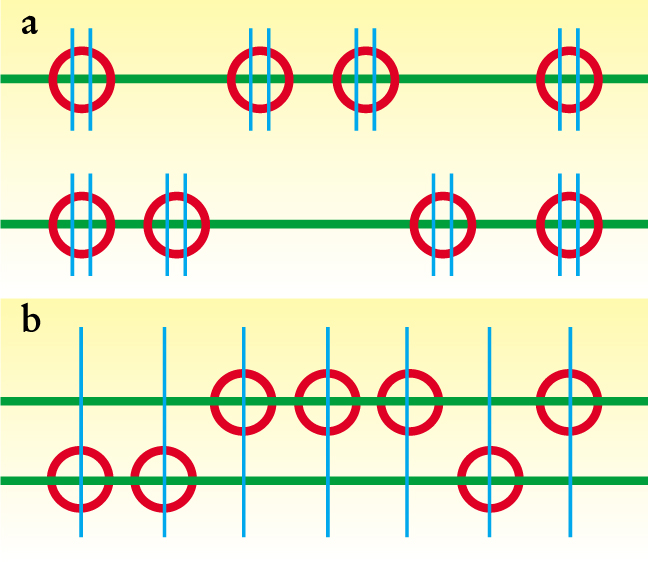Figure 2. Quantum Hall bilayers are depicted by electrons (red circles) associated with magnetic flux quanta (blue lines). (a) At large separation, each electron is associated with two flux quanta and is little influenced by electrons in the other layer. (b) At small separations, the electrons move in a collective state, each associated with a single flux quantum and each keeping its distance from the others.