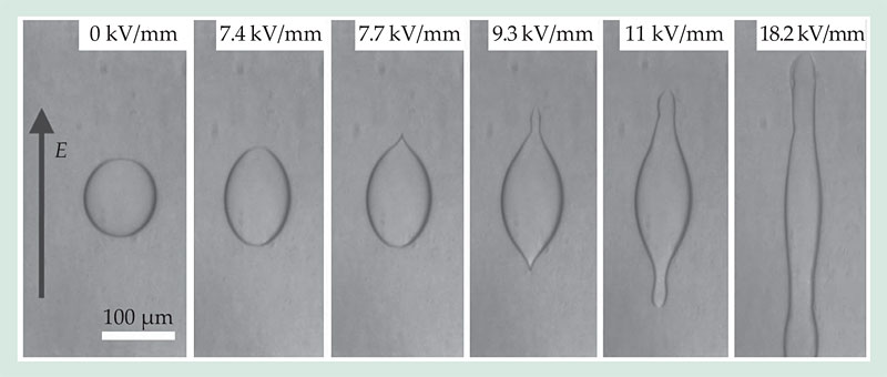 Researchers Qiming Wang, Xuanhe Zhao (both at Duke University), and Zhigang Suo (Harvard University) have now cleverly sidestepped both obstacles and made the first observations of highly charged, deforming droplets in a solid polymer. 1 To do so, they sandwiched a millimeter-thick layer of saltwater-laden silicone rubber between two rigid insulating plates coated with transparent electrodes. The plates suppressed the polymer’s overall deformation and prevented it from shorting out in high fields. With that setup, the researchers used optical microscopy to monitor the embedded water droplets’ behavior as a function of electric field.