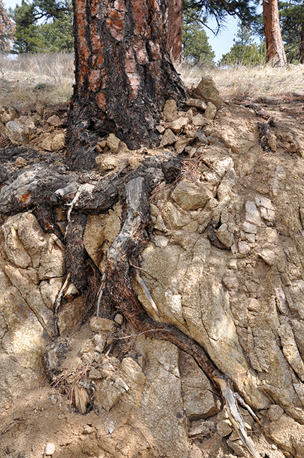 The roots of a ponderosa pine pry open fractures in bedrock in the Betasso catchment in Colorado. Measurements of contact forces between the rocks and the roots show enigmatic daily cycles. And the cracks speed up rock weathering by allowing faster penetration of water and organic matter.
