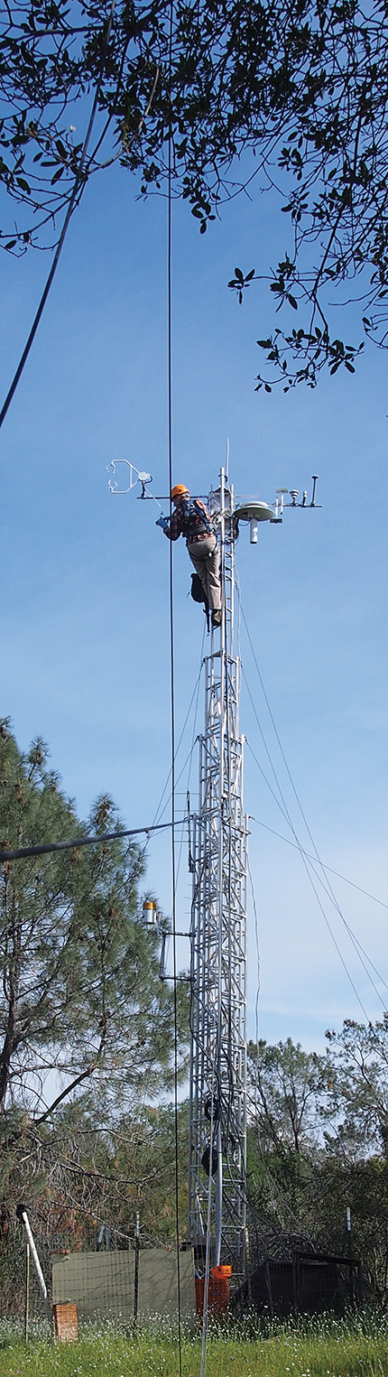 Eddy flux towers—so named because they measure vertical turbulent fluxes—are installed at many critical-zone observatories to monitor the exchange of water and carbon dioxide between the ecosystem and atmosphere. This one is in the foothills of California’s Sierra Nevada and is part of the Southern Sierra Critical Zone Observatory.