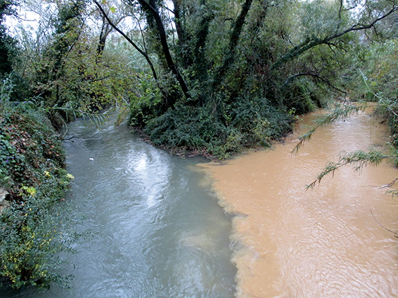 Flash floods, like this one at the Koiliaris Critical Zone Observatory on Crete, are an important part of the surface-water budget in the fractured karst limestone bedrock of the Mediterranean region. Although this tributary floods only three or four times a year, flash floods collectively carry up to 70% of its suspended sediments and many pollutants to sea.
