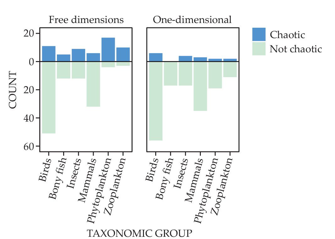 The 1990s had indeed seen numerous studies reporting that ecological chaos was rare. Chaos was first introduced to the field two decades earlier in simple theoretical models from Robert May, John Beddington, and their colleagues. The expectation was that chaos could explain the observed fluctuations in animal population sizes. And so ecologists sought evidence of chaos in empirical data, a quest that reached a fever pitch in the 1990s and culminated in a 1995 meta-analysis that found evidence of chaos in only around 10% of the surveyed population time series—the regularly occurring counts of species’ population size at a given location.