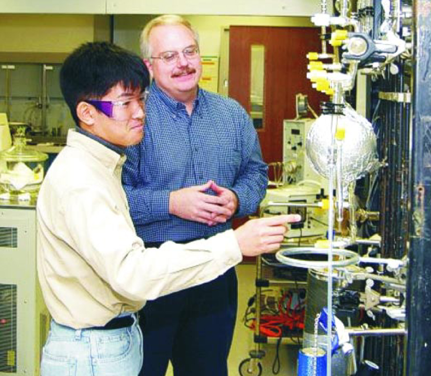 Student collaborations with industry provide a win–win situation. Here Satoshi Nishida, a physical chemistry graduate student from the University of Nagoya in Japan, describes the atmospheric research he is conducting at the Ford Research Laboratory to Ford physicist John Ginder.