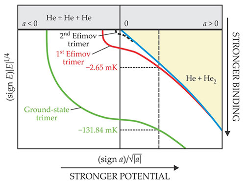 Figure 1. Computationally scaling the helium–helium potential strength— inversely related to its scattering length a—shows the hypothetical behavior of its trimer states if the potential could be made stronger or weaker. Three-body bound states can exist only in the white region of the diagram. Above the blue curve, which represents the dimer energy, He + He2 is energetically favorable to He3; above the thick black line at E = 0, all bound states dissociate into monomers. The Efimov trimers—which are infinite in number, although only the first two are shown—all disappear as the potential is made stronger, but the ground-state (non-Efimov) trimer does not. The natural He potential, represented by the vertical dashed line, has two trimer states: the ground state and first Efimov state. Both of their energies E are best expressed in millikelvin. (Adapted from ref.