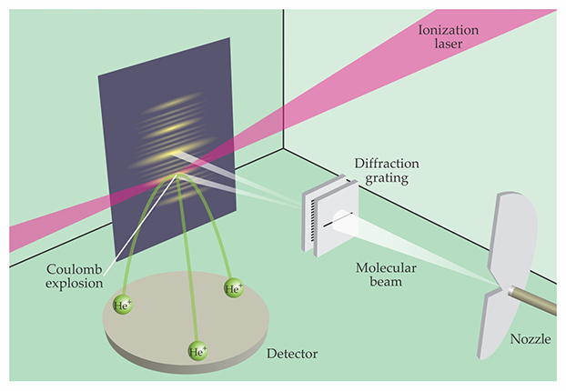 Most of the atoms in a He molecular beam exist as unbound monomers, with only a few combining into dimers, trimers, tetramers, and larger clusters. In 1994, J. Peter Toennies and Wieland Schöllkopf devised a way to sort such fragile clusters using matter-wave diffraction. 4 Just as optical diffraction gratings separate light by wavelength, matter-wave diffraction gratings separate particles by their de Broglie wavelength. In a cryogenic beam, He atoms have a de Broglie wavelength of a few angstroms, so a grating with periodicity 100 nm deflects them by a few milliradians. Dimers are deflected by half as much; trimers by a third.