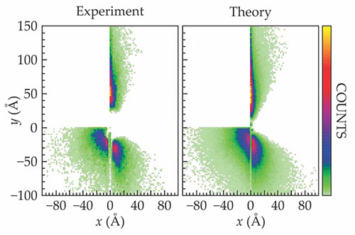 Figure 3. The structure of the helium Efimov trimer is an elongated triangle, with one atom far removed from the other two. The panel on the left shows the experimental data: For each ionization event that was identified as an Efimov trimer, the reconstructed structure was positioned so that its center of mass was at the origin, the axis of its smallest moment of inertia lay along the vertical axis, and the upper left quadrant was empty. The panel on the right shows a simulation of the same process using the theoretically predicted Efimov structure. (Adapted from ref.