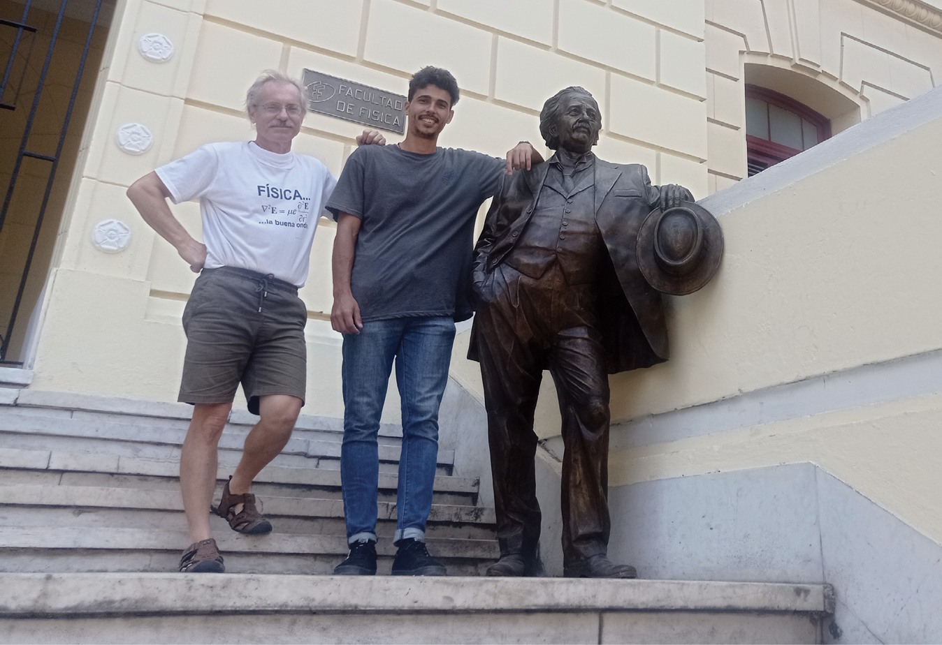 Albert Einstein is the newest fixture at the physics department at the University of Havana in Cuba. Physics student Diego Valdés (next to Einstein) helped cast the statue, which was the brainchild of physics professor Ernesto Altshuler (left). (Courtesy of Ernesto Altshuler.)