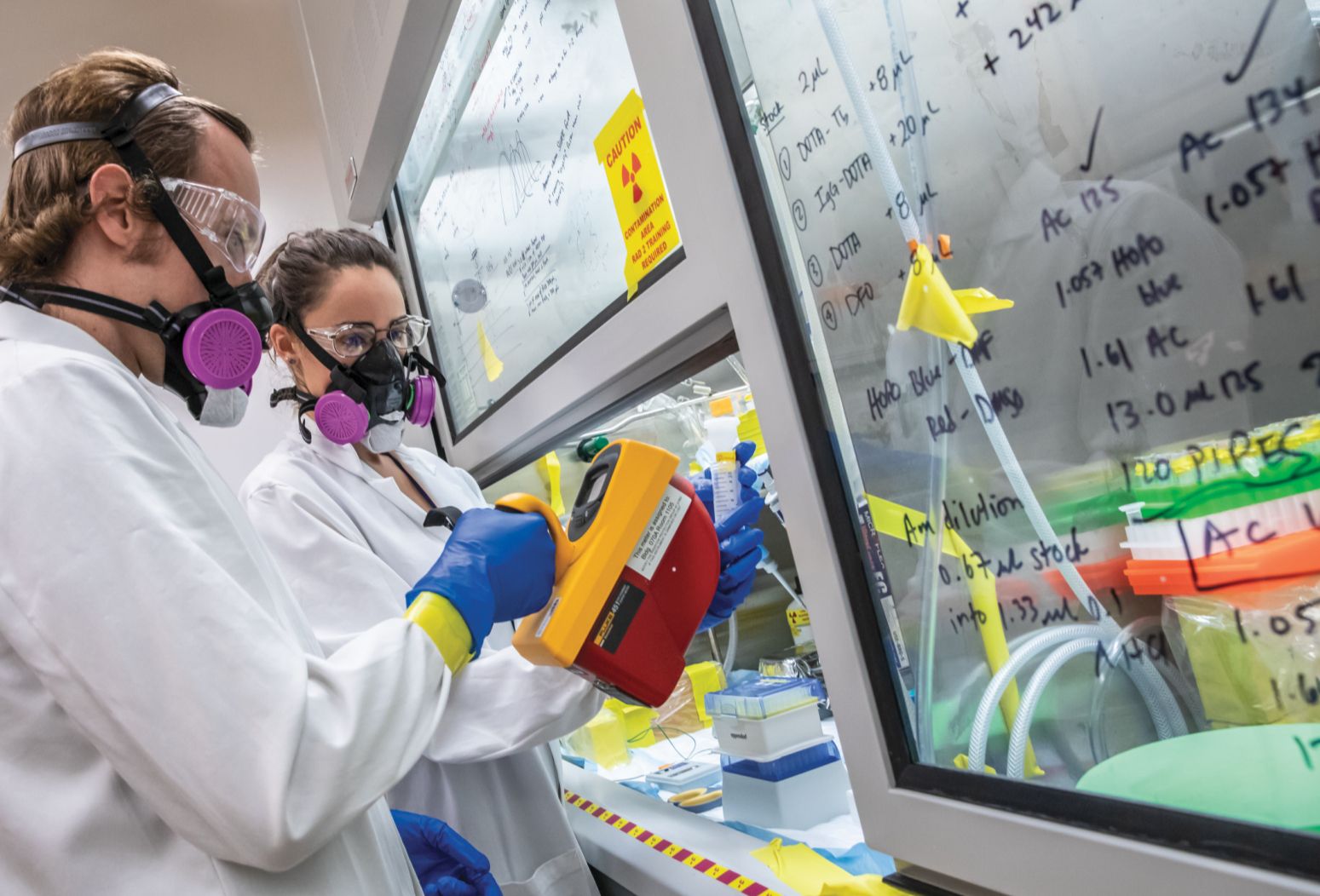 Korey Carter (left) and Katherine Shield study the chemistry of einsteinium (atomic number 99) in Rebecca Abergel’s lab. (Photo by Marilyn Sargent, the Regents of the University of California, Lawrence Berkeley National Laboratory.)