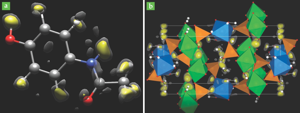 Figure 1. Structural models of (a) paracetamol and (b) framework cobalt aluminophosphate, derived from electron-diffraction data. Non-hydrogen atoms are shown explicitly, and the hydrogen-atom positions are established from electrostatic potential peaks. Large peaks are shown in yellow and smaller ones in gray; in each case, the largest peaks agree well with the known or expected locations of H atoms. (Adapted from ref.