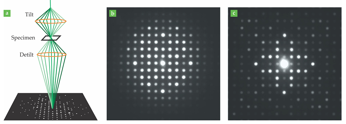 Figure 2. (a) In precession electron diffraction (PED), the electron beam is tilted and precessed about a desired beam axis; the diffracted beams are recombined and their intensities are integrated to produce a diffraction pattern. (Omitting the detilting step would yield overlapping circles instead of discrete diffraction peaks.) (b) Without PED, multiple scattering muddies the relationship between peak intensity and crystal structure, and diffraction patterns are difficult to interpret. (c) With PED, the brightest peaks correspond to the strongest crystal reflections. (Panels b and c adapted from P. A. Midgley, A. S. Eggeman, IUCrJ 2, 126, 2015.)
