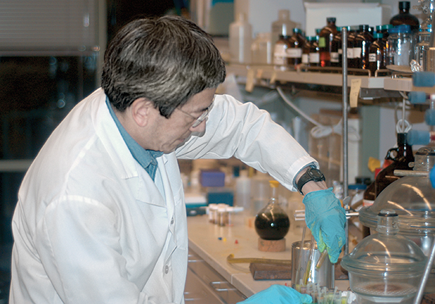 Figure 1. Nobel laureate Roger Tsien at a lab bench. The green stains on his gloves give away his activity: synthesizing fluorescent dye.