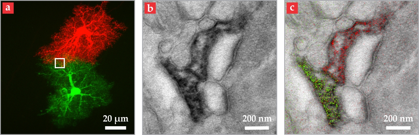 Figure 2. Synaptic Activity in the brain is regulated with the help of nonneuronal cells called astrocytes. (a) This fluorescence-microscope image reveals two astrocytes that have been injected with different cell tracers. (b) A conventional transmission-electron-microscope image of the area inside the white square in panel a has far higher resolution, but cell boundaries and other details are obscured by insufficient contrast. (c) Those details are brought out by selectively depositing in each cell a molecular complex that carries cerium (green) or praseodymium (red). Then spatially resolved electron energy-loss spectroscopy maps the elements’ locations. (Adapted from ref.