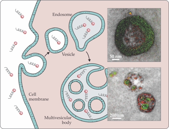 Figure 3. Endocytosis is one process by which cells (shaded area) take in material from the extracellular environment. A small section of the cell membrane folds in on itself and envelops material outside the cell. The section pinches off to form a vesicle that then carries the internalized cargo to an endosome. Through a similar process, the endosome matures into a body that contains multiple vesicles. In the example illustrated here, the molecules brought into the cell are IR-fluorescent dyes (red spheres) attached to small amino acid chains called cell-penetrating peptides. The insets are lanthanide-resolved colorized transmission-electron-microscope images that highlight cell-penetrating peptides (red) inside an endosome (top) and two multivesicular bodies (bottom). (Insets adapted from ref.
