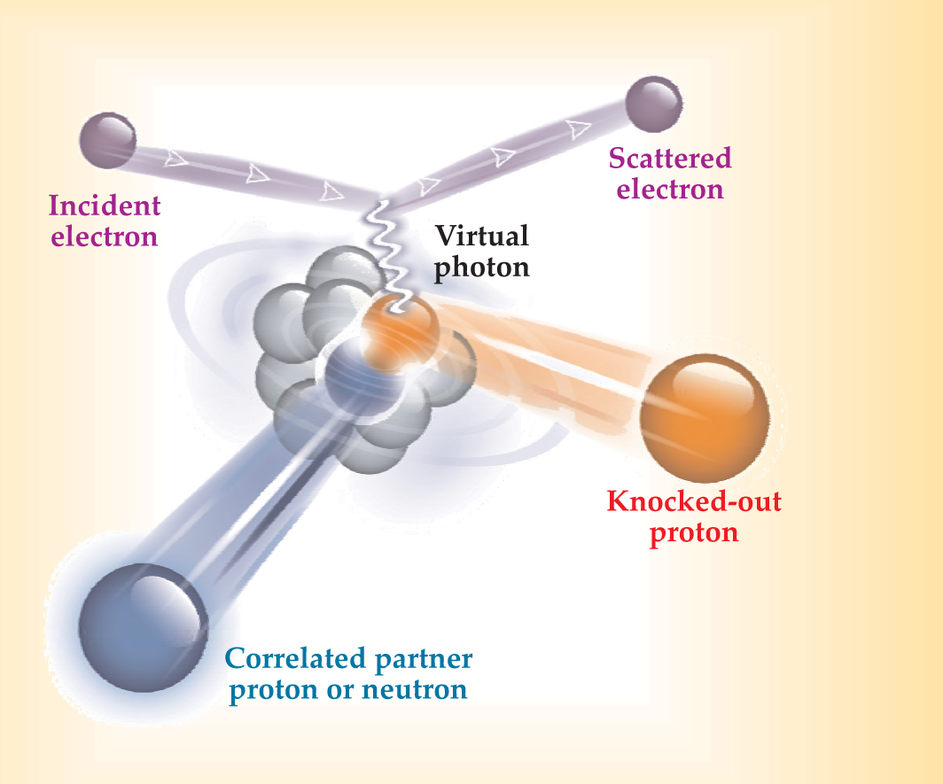 At the time, some theorists attributed the difference to correlations between nucleons. A rich variety of low-energy nuclear phenomena, including collective rotations and vibrations, shape mixing, and superfluidity, are known to originate in correlations between nucleons separated by several femtometers. But those long-range correlations make up less than half the difference. Short-range correlations (SRCs), on the scale of a femtometer or less, can close the gap, but direct evidence for them has proven elusive. Still, physicists have surmised their presence for decades, not least because short-range repulsion between nucleons prevents the collapse of a nucleus.