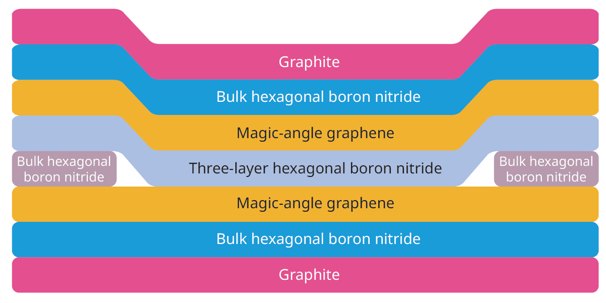 Their experimental device, sketched below, was intricate to construct. Several of the layers are atomically thin, the two graphene layers each have electrodes attached at several points, and the central layer of bulk hexagonal boron nitride has a precisely etched hole through which the adjoining layers must smoothly contact each other.