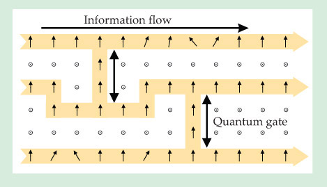 Figure 1. One-way quantum computation. Starting with an array of qubits in a highly entangled state—each site on the square lattice hosts a qubit, and each pair of nearest neighbors is directly entangled—a computation is carried out solely through single-qubit measurements, indicated by the directions of the black arrows. (Adapted from ref.