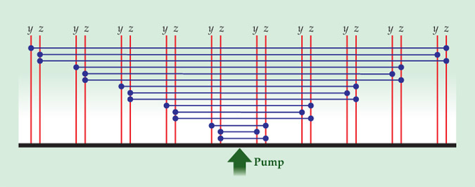 Figure 2. Entangling many modes (red lines) in an optical frequency comb with a single pump mode. The green arrow represents half the pump frequency; an optical parametric oscillator generates entanglements, represented by the blue lines, between modes whose frequencies add up to the pump frequency. Because the y and z polarizations of each frequency are treated as separate quantum modes, the modes are entangled in groups of four.