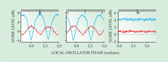 To test the entanglement, the researchers measured the noise level in the electric field as a function of phase for linear combinations of the entangled modes. To make the phase-specific measurements, they combined the frequency comb modes with a two-color local oscillator, a beam whose spectrum contained the two frequencies whose entanglement they wanted to check. They ran the check on 15 clusters of modes that they expected to have entangled, starting with the adjacent modes in the frequency comb, as shown in the left panel of figure 3, and ending with the widely spaced pair shown in the center panel. A noise level of 0 dB is the minimum level of quantum fluctuations of modes that are unsqueezed and unentangled; noise levels below 0 dB constitute entanglement.