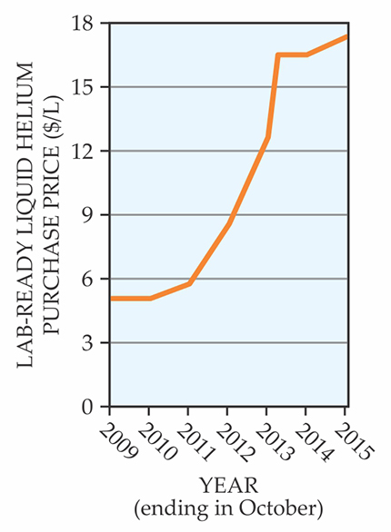 The purchase price for liquid helium for chemist Sophia Hayes of Washington University in St. Louis rose nearly 250% during the five years ending October 2015. (Adapted from the APS/ACS/MRS report Responding to the U.S. Research Community’s Liquid Helium Crisis.)