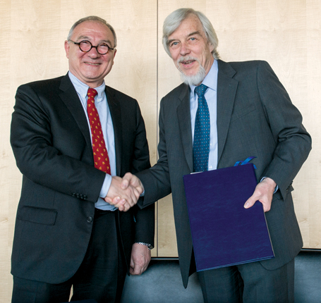 The European Space Agency’s Jean-Jacques Dordain (left) and CERN’s Rolf Heuer at the ceremony formalizing collaborations between the organizations they lead.