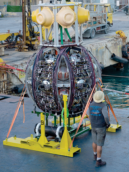 A string of 18 optical modules, wound on a sphere, is on its way to be deployed deep underwater as part of the KM3NeT neutrino telescope. The telescope will have a total of 345 such strings at two sites, off the shores of France and Italy. It will also offer ports for Earth and sea science studies. The KM3NeT project is back on the road map of the European Strategy Forum on Research Infrastructures after having been reconfigured and halving its cost.