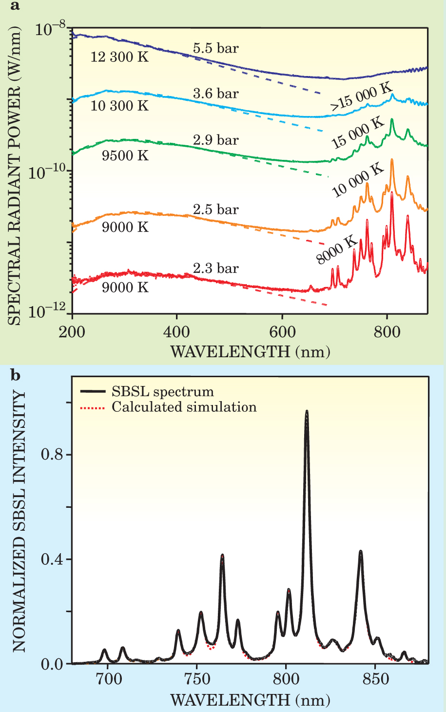 Figure 2. Emissions from a sonoluminescing bubble testify to the presence of a plasma. Spectral peaks seen at wavelengths longer than 650 nm correspond to transitions between excited states of argon that are likely to have been populated by collisions with energetic charged particles, and not thermally excited. (a) Spectra at five different acoustic pressures. Temperatures at short wavelengths are estimated from blackbody fits (dashed lines); those at higher wavelengths from the relative population of Ar’s excited states. (b) The Ar line emission at 2.8 bar with the continuum subtracted (solid line) nicely fits the simulations (dotted). Lines correspond to transitions between 4p and 4s states of Ar.