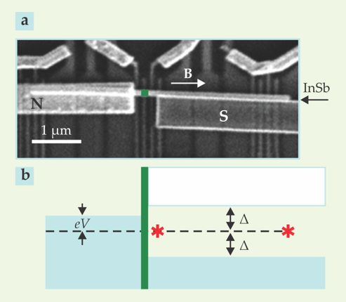 Kouwenhoven set off to re-create that experiment, but with an InSb wire connected to a normal-metal gold electrode on one side of the circuit and a superconducting niobium titanium nitride electrode on the other (see figure 1). The appeal of NbTiN lay in its ability to superconduct in the presence of a high magnetic field.
