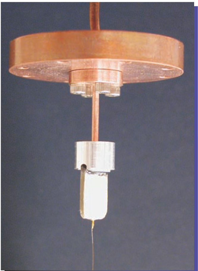 Figure 1. Torsional oscillator. The silvery disk, 15 mm in diameter, encloses a cylinder of porous Vycor® glass filled with solid helium-4. When driven by electrodes, the 4He-filled disk oscillates on a torsional rod and its resonant period is detected. Image shows only the central electrode—a flat, white slab. The brass disk is a mechanical filter.