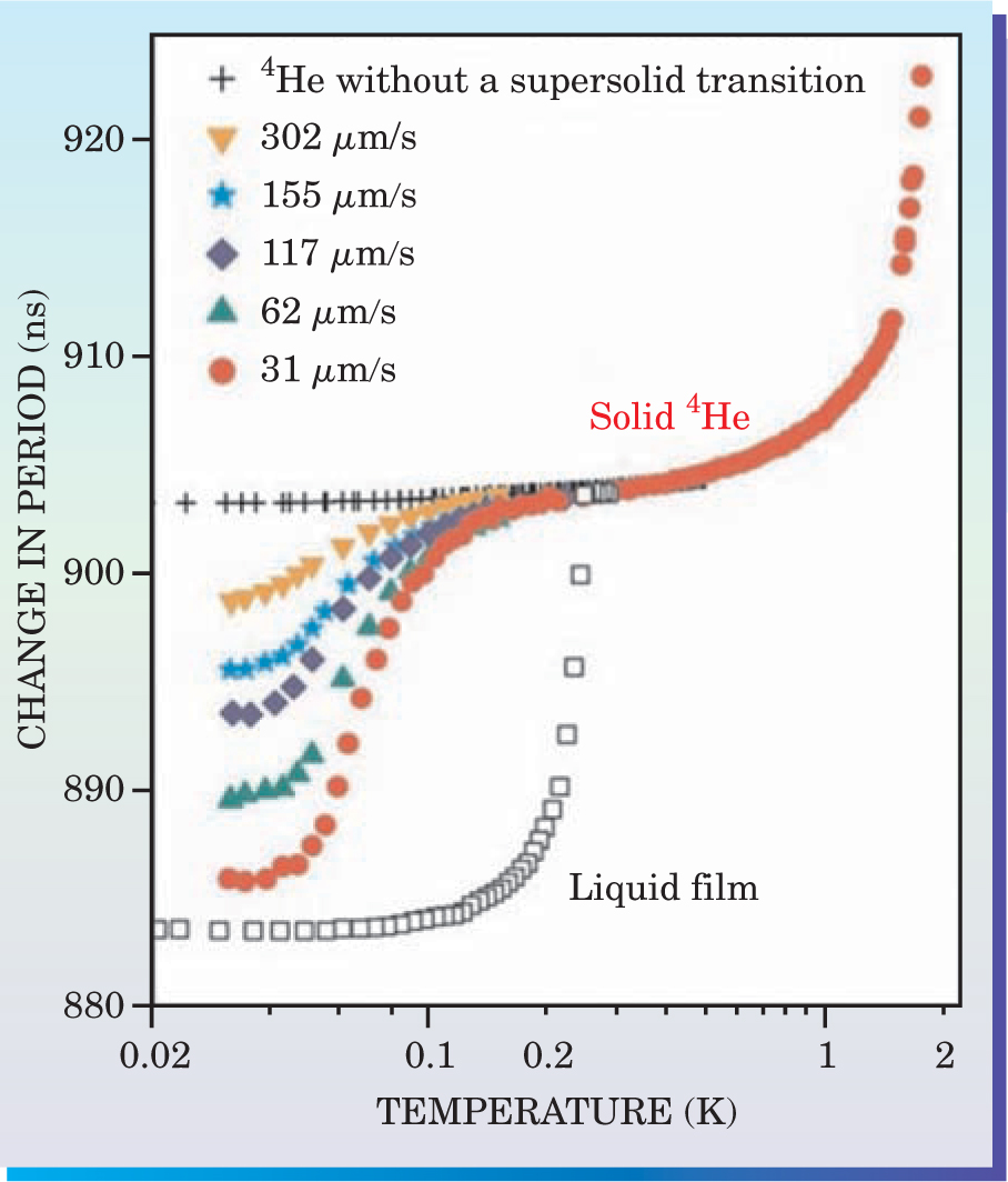 Kim and Chan cautiously titled their experimental report a “probable observation” of the supersolid. They have tried to rule out other factors that could give the same results. Perhaps the 4He was not fully solidified, so that the change in period came from a liquid 4He film on the Vycor surfaces. As one check of that possibility, the researchers measured the period of the Vycor disk with a thin liquid film and found virtually no dependence on rim velocity, in contrast to the solid 4He samples. The pair also verified that the drop in period did not occur in solid 3He (a Fermi system) nor in solid 3He–4He mixtures with much more than 0.01% of the lighter isotope.