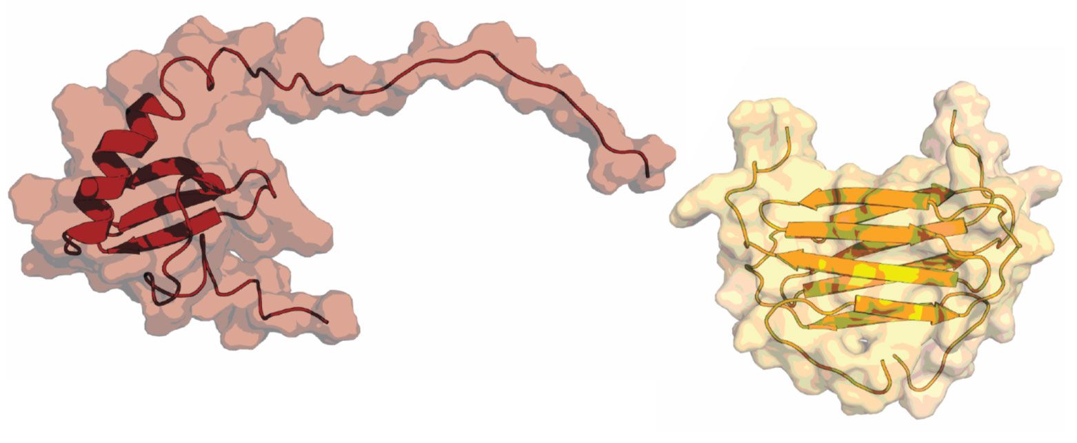 Immune protein XCL1 switches between two different folded configurations that are equally stable under physiological conditions. In the chemokine fold (red), characterized by a helical structure and shared by the 50 proteins in the class, the protein binds to a receptor on a white blood cell and traffics the cell toward an infection site. In the alternative fold (gold), characterized by multiple sheet structures indicated by thick arrows, the protein directly attacks a virus or bacterium. (Courtesy of Acacia Dishman/Medical College of Wisconsin.)