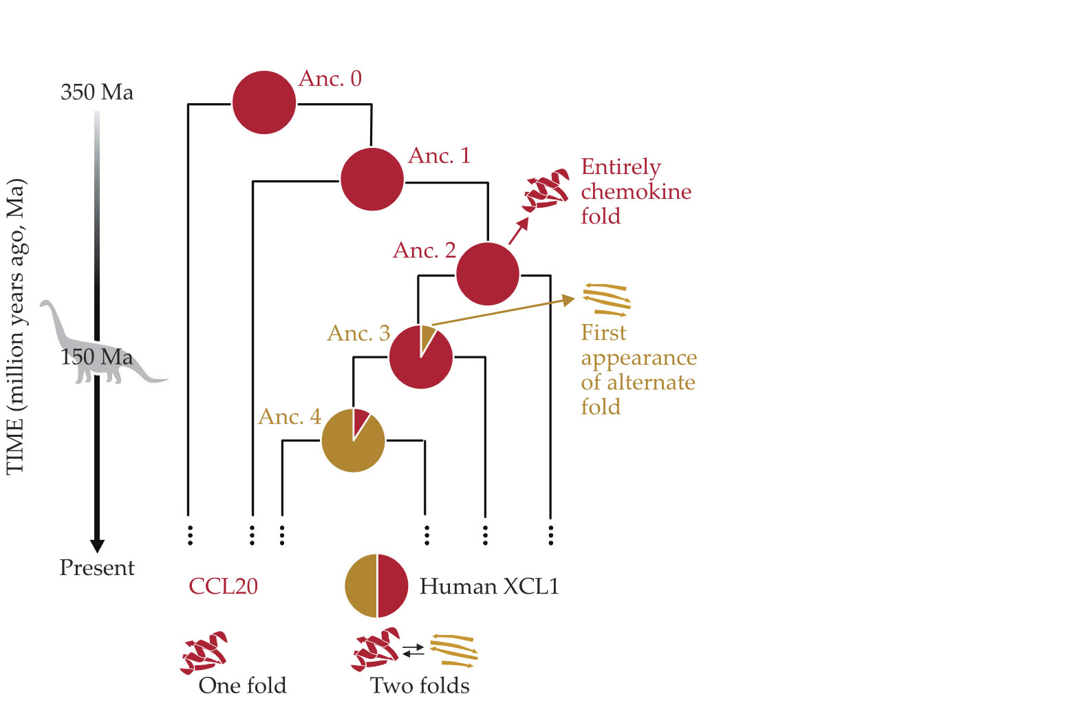 XCL1’s ancestors evolved to favor an amino acid sequence that folded into the chemokine fold (red) and an alternate fold (gold). The fractional abundance of each arrangement adopted by the human immune protein shifted over time, first favoring one and then the other as represented by the pie charts, before arriving at XCL1’s modern 50-50 split. Another modern protein, CCL20, retained the single fold of a 350-million-year-old Ancestor 0 (Anc. 0). Metamorphic folding may have evolved via a subset of key amino acid sequence changes that evolved from Ancestor 2 to Ancestor 3 around 150 million years ago (Ma). (Adapted from ref.