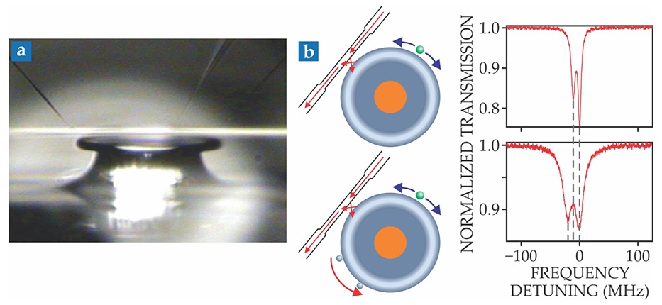 Like the ring-laser gyroscope, Yang and colleagues’ sensor was based on the mode splitting of a ring-shaped resonator at a diabolic point. When a particle approaches the surface of the sensor’s solid silica ring, it couples to the resonator’s evanescent field. As a result, some photons are scattered out of the ring entirely, while others remain in the ring but change their direction, from clockwise to counterclockwise or vice versa. The scattering lifts the degeneracy of the resonator’s eigenmodes—essentially the symmetric and antisymmetric combinations of the clockwise and counterclockwise waves—which are split in frequency by an amount related to the particle size.