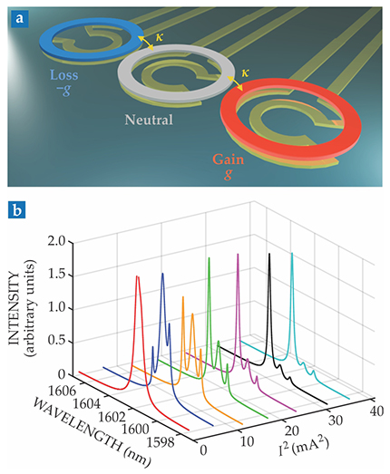 A parity–time symmetric sensor at a third-order exceptional point. Three semiconducting rings (a) are optically pumped to produce gain g in one, loss −g in another, and neither in the third. They’re evanescently coupled with coupling constant κ, and each can be tuned with a separately controllable gold microheater. When one of the rings is heated with a current I (b), the symmetry is broken and the resonant frequencies split. (Adapted from ref.