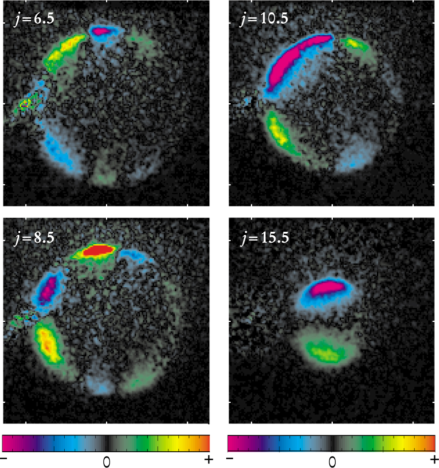 Figure 2. Collisions scatter nitric oxide molecules in different directions, depending on their sense of rotation and final angular momentum j. In these images, the collisions are viewed in their center of mass frame from above. The NO beam comes from the right; the Ar beam from the left. Because NO originated from the right, the left side of the images captures forward-scattered NO; the right side, back-scattered NO. The four images were produced by subtracting images of clockwise rotating molecules from those of counterclockwise rotating molecules. The color bar extends from purple (all clockwise) to red (all counterclockwise).