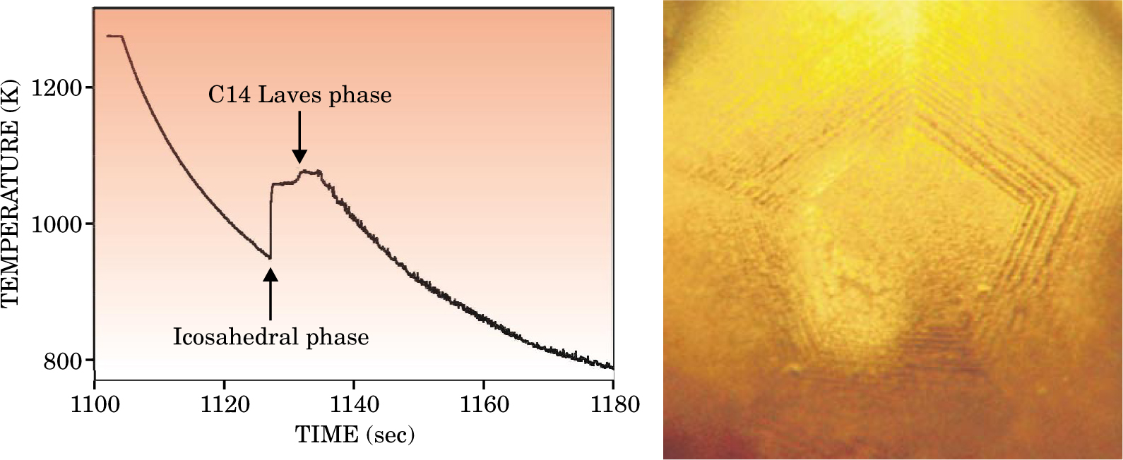 Figure 2. As a molten drop cools, its temperature rises sharply at two specific phase transitions (left). First, when the liquid forms the metastable icosahedral phase, which is quasicrystalline, and later when it forms the C14 Laves phase, which is crystalline. An optical mircograph (right) of the 2-mm-sized drop in its metastable state reveals pentagonal ridges.