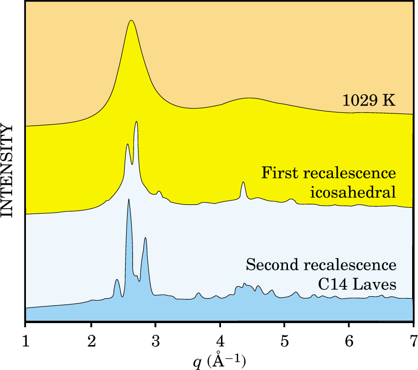 Figure 3. X-ray diffraction patterns capture the structural changes as the molten alloy (top) cools to solidify first into the icosahedral phase (middle) and then to the C14 Laves phase (bottom). The peaks occur at the predicted locations and are plotted as a function of the momentum transfer q = 4π sinθ/λ, where θ is the scattering angle and λ is the x-ray wavelength.