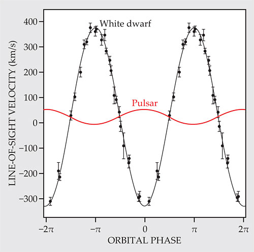 Figure 1 shows the 2.46-hour oscillation of the line-of-sight velocity components of the white dwarf and the pulsar as measured, respectively, by spectral Doppler shifts and pulsar timing. The ratio of their oscillatory amplitudes measures the ratio q ≡ Mp/Mwd of their masses to be 11.7 ± 0.1.