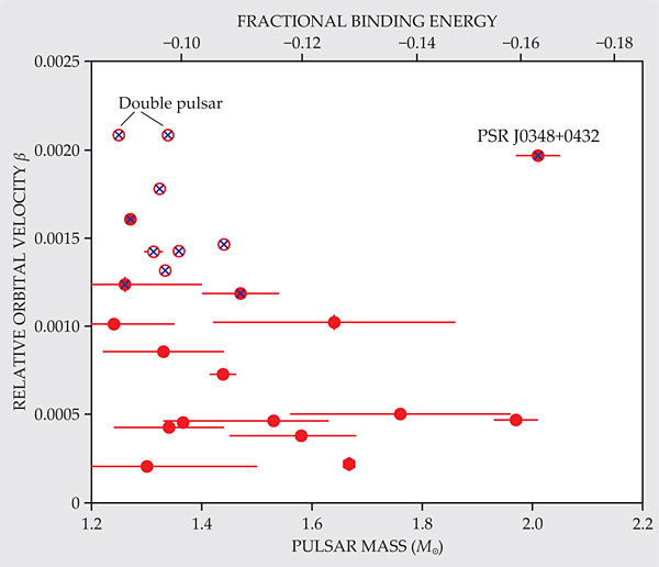 Figure 2. All binary radio pulsars with measured masses and no significant tidal or mass losses are plotted by mass (with corresponding gravitational binding energy) and orbital-velocity parameter β, which is essentially the relative velocity of the two stars, divided by c, in their center-of-mass frame. Solid and open circles indicate, respectively, pulsars with white-dwarf or neutron-star companions. One pulsar (the hexagon) has an ordinary stellar companion. Blue crosses mark binaries for which orbital decay has been measured. Sitting alone at extreme mass and orbital speed is J0348. (Courtesy of Norbert Wex.)