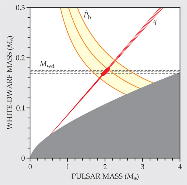 Figure 3. Constraints imposed on the masses of the binary pulsar J0348 by measurements of the white-dwarf mass Mwd, the mass ratio q, and the time derivative of the orbital period. In each case, the triplet of lines indicates one standard deviation. The curves are calculated assuming the correctness of general relativity (GR). The other lines are independent of that assumption. The intersection of the q and Mwd lines, shown as a 95%-confidence ellipse, falls nicely inside the swath, indicating the degree to which the measurements confirm GR. The gray area is nonphysical. (Adapted from ref. 1.)