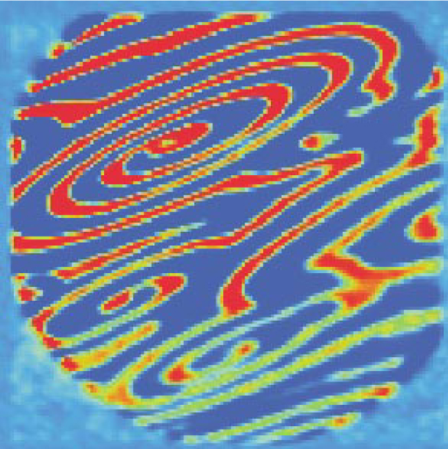Figure 1. Chaotic spiraling patterns of carbon dioxide and oxygen can form on a platinum surface. In this snapshot from a photoemission electron microscope (PEEM), red represents the areas of the Pt surface covered in carbon monoxide; areas covered by atomic oxygen are shown in blue. The field of view is 500 µm across.