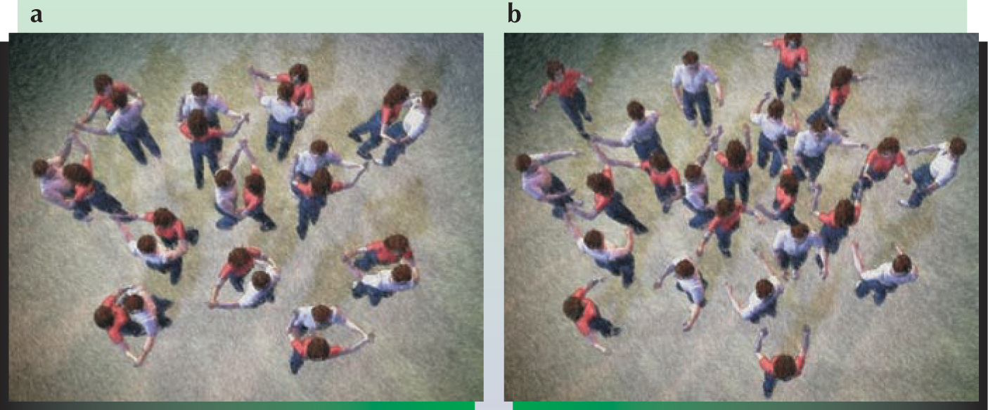 Figure 1. Two modes of pairing. (a) Couples embracing while they dance illustrate the tight binding of atoms in a molecule, (b) Partners who face one another, but dance far apart are like weakly interacting atomic pairs.