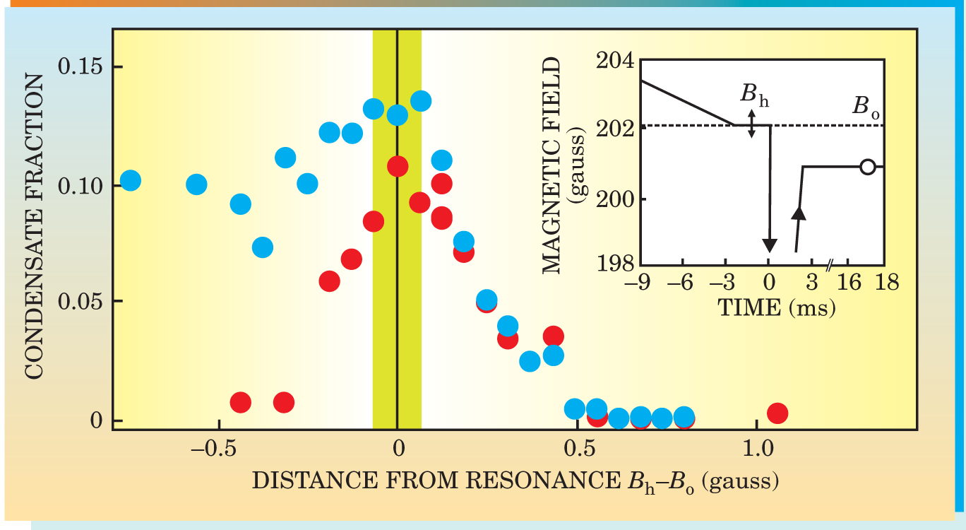 The Colorado team solved this problem by devising a procedure that essentially “projected” atoms pairwise onto molecules: That meant sweeping the magnetic field in a certain way, as sketched in the inset of figure 2. Regal, Greiner, and Jin started with their gas on the BCS side of resonance, lowered the magnetic field and held it at a particular value, B h, to allow pairs to form. Then they rapidly swept the field to a point B f far from resonance on the BEC side. By this procedure, the researchers maintain, atoms that formed pairs at B h will find themselves bound into molecules at B f.