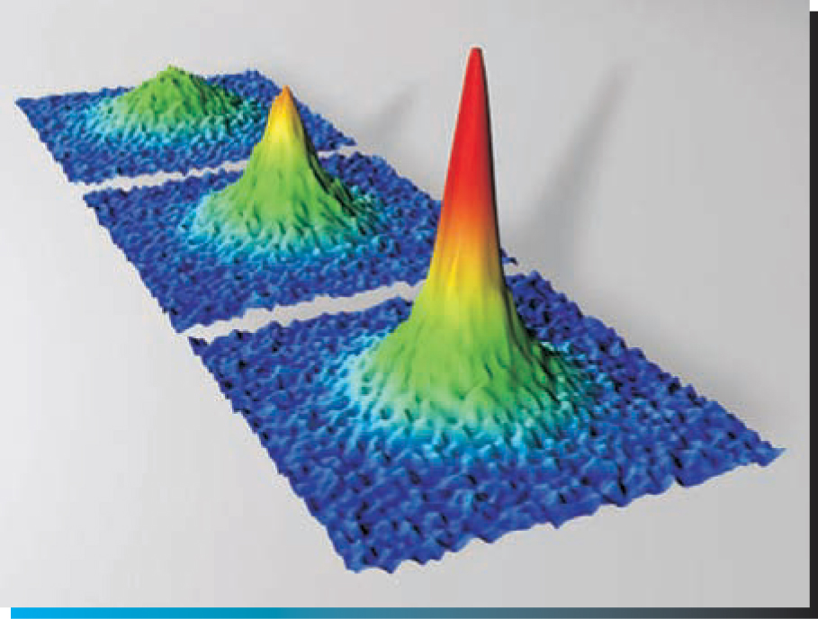 Regal, Markus, and Jin were not surprised to see a condensate peak develop when the magnetic field was held on the BEC side of the resonance because the three had already produced a molecular condensate there. 1 But, as seen in figure 2, a condensate peak also grew at resonance and on the other side of it, where molecules cannot form. The researchers concluded that the condensate could not come from molecules but must stem from strongly interacting fermionic atoms, so they called it a fermionic condensate.