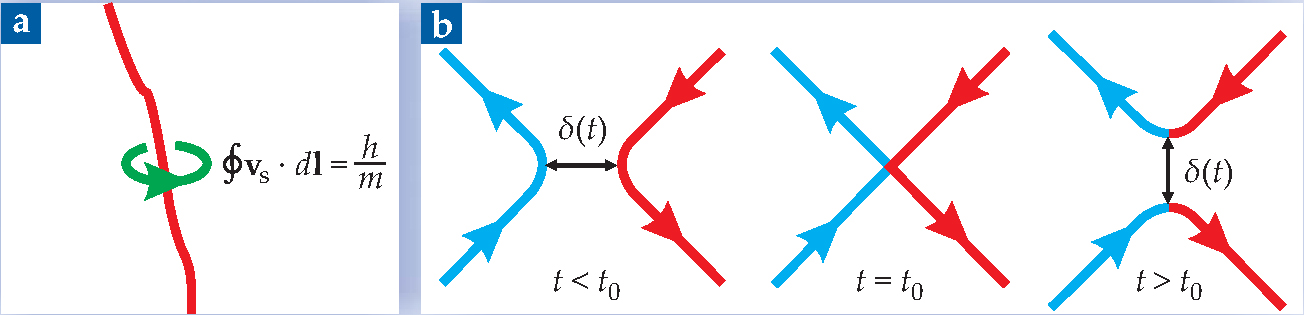 Figure 1. Quantized vortex lines in superflluids. (a) Circulation of superfluid around the vortex line is quantized so that the contour integral of its velocity around any loop enclosing one line is h/m, where m is the relevant boson mass for the particular superfluid. (b) Reconnection of two vortex lines at time t0. The reconnection dynamics can be described by δ(t), the time dependence of their smallest separation. Colored arrowheads indicate the sense of the superfluid circulation around the vortex lines.