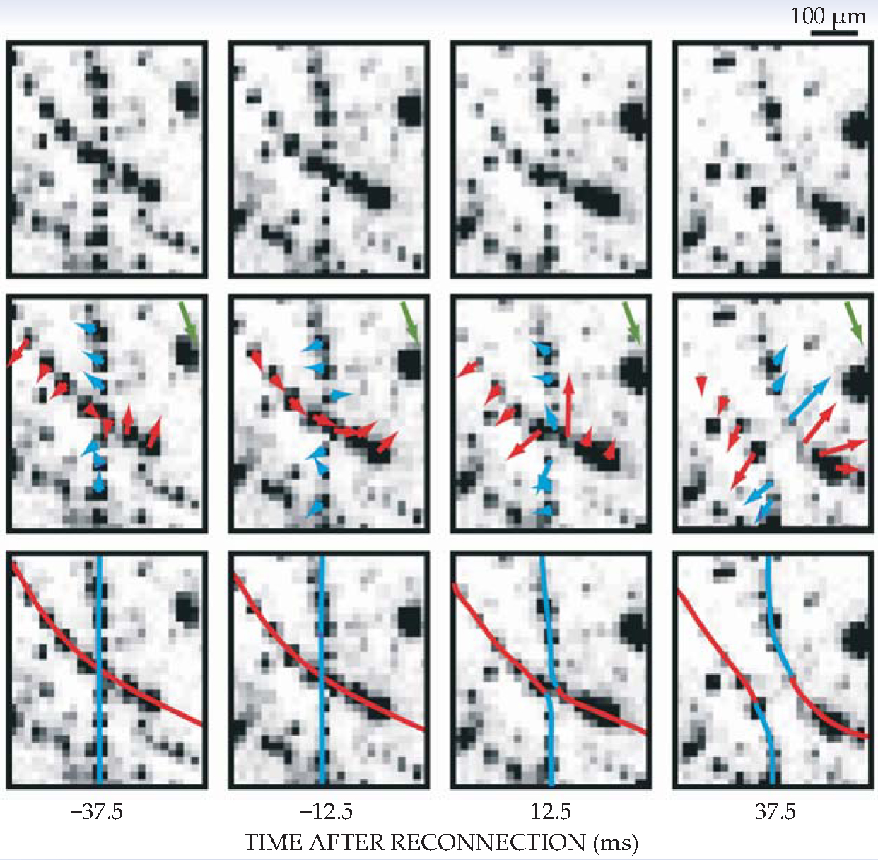 Figure 2. Close-ups of a reconnection event in superfluid helium-4 digitally filmed in an experiment at the University of Maryland. Reflective tracer particles adhering to the reconnecting vortex lines make them visible in these negative images. In the middle row, the green arrow indicates the local background flow velocity, and the red and blue arrows give background-subtracted velocities for the two vortex lines whose reconnection is delineated by the colored curves in the bottom row.