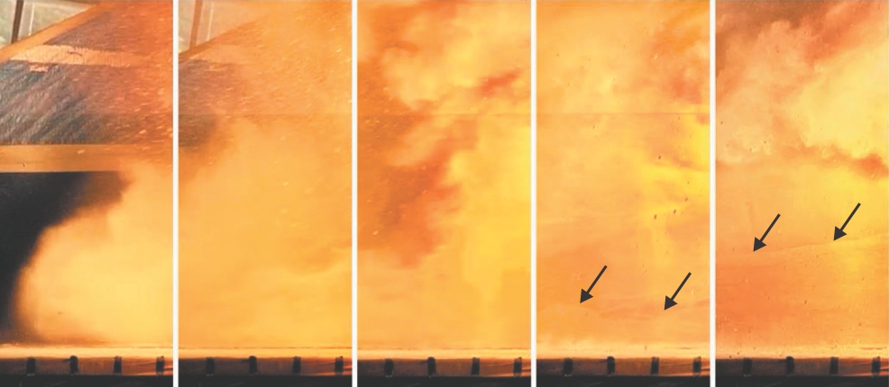 The volcano eruption simulator facility at Massey University in New Zealand produces experimental pyroclastic flows—hot avalanches composed of air, ash, and rock—that allow the study of their dynamical behavior. In this series of images spanning about a second, the bottom meter of a two-layer flow passes a fixed observation point. The arrows denote the boundary between a denser particle layer overridden by dilute, turbulent ash.